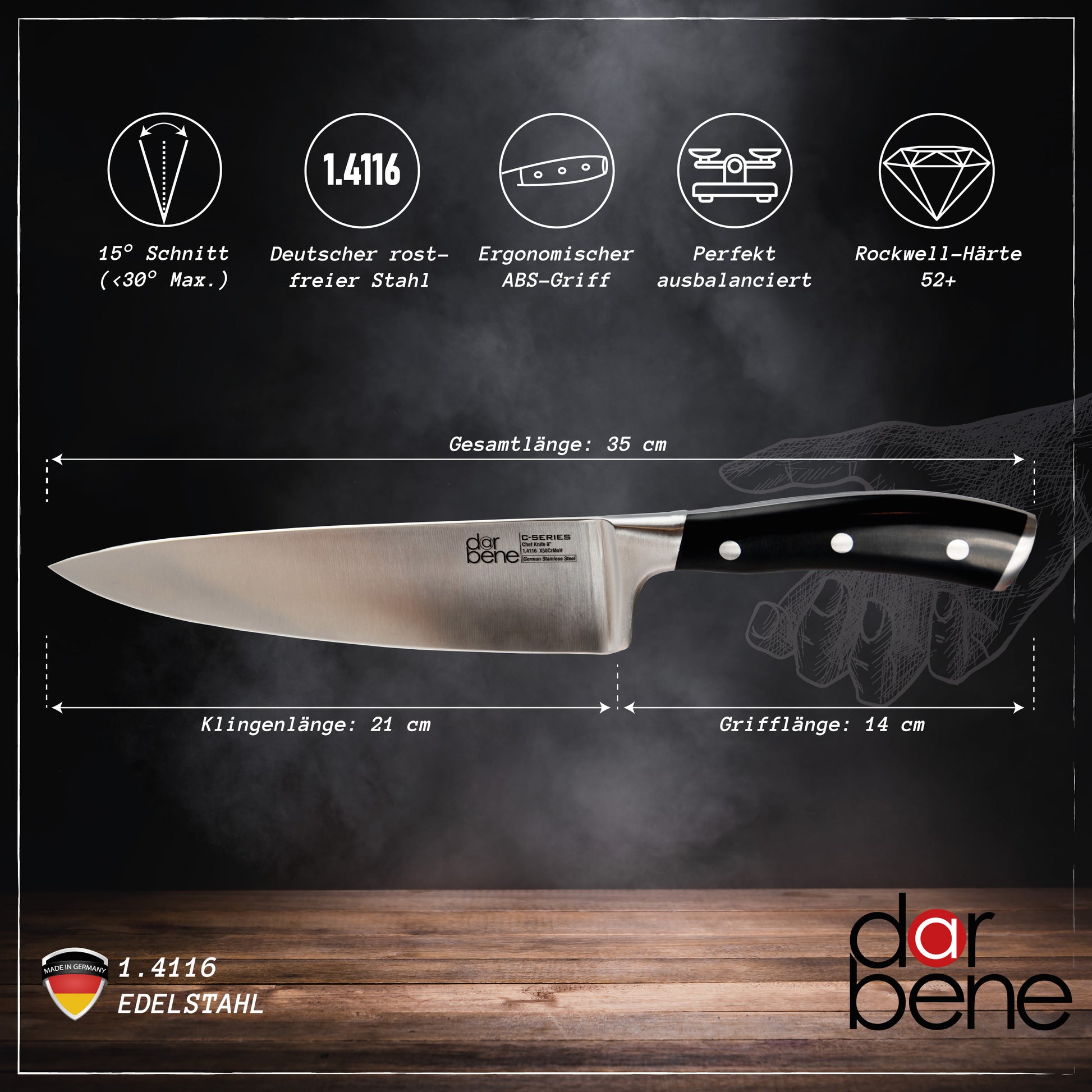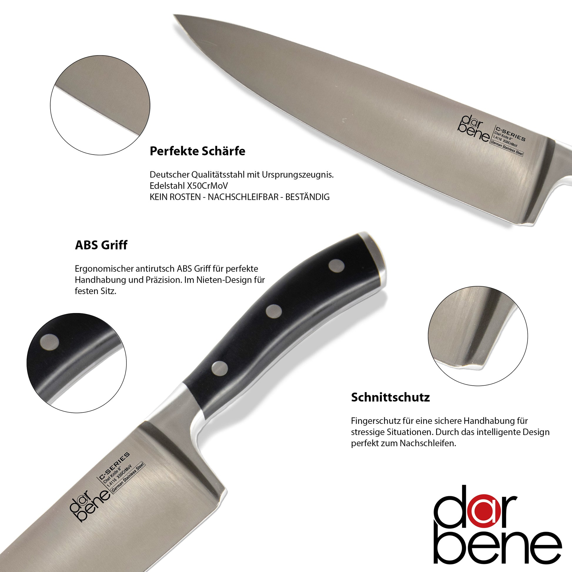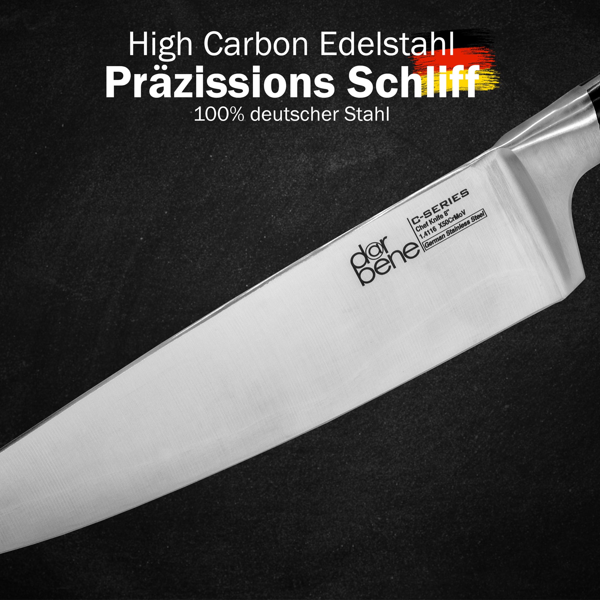 Edelstahl - Made in Germany: DarBene Küchenmesser werden aus 100% deutschem Stahl gefertigt - mit Ursprungszeugnis. Verlässliche Qualität, Langlebig und höchste Präzision für Ihre Küche. Die Verarbeitung und Materialeigenschaften wurden durch unser hausinternes, ISO-zertifiziertes Testlabor überprüft und in externen Prüflabors kontrolliert.
