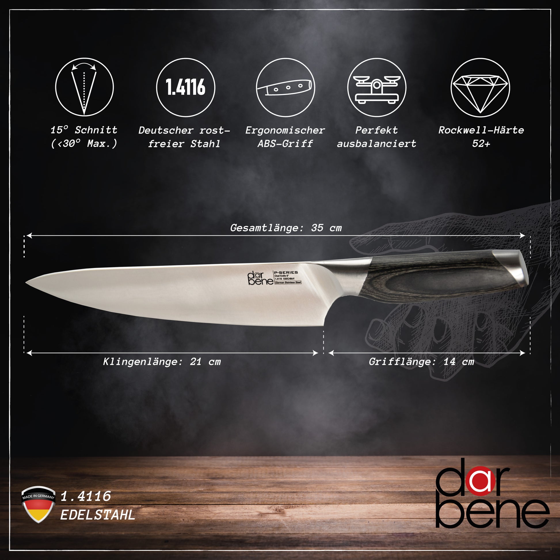 Edelstahl - Made in Germany: DarBene Küchenmesser werden aus 100% deutschem Stahl gefertigt - mit Ursprungszeugnis. Verlässliche Qualität, Langlebig und höchste Präzision für Ihre Küche. Die Verarbeitung und Materialeigenschaften wurden durch unser hausinternes, ISO-zertifiziertes Testlabor überprüft und in externen Prüflabors kontrolliert.