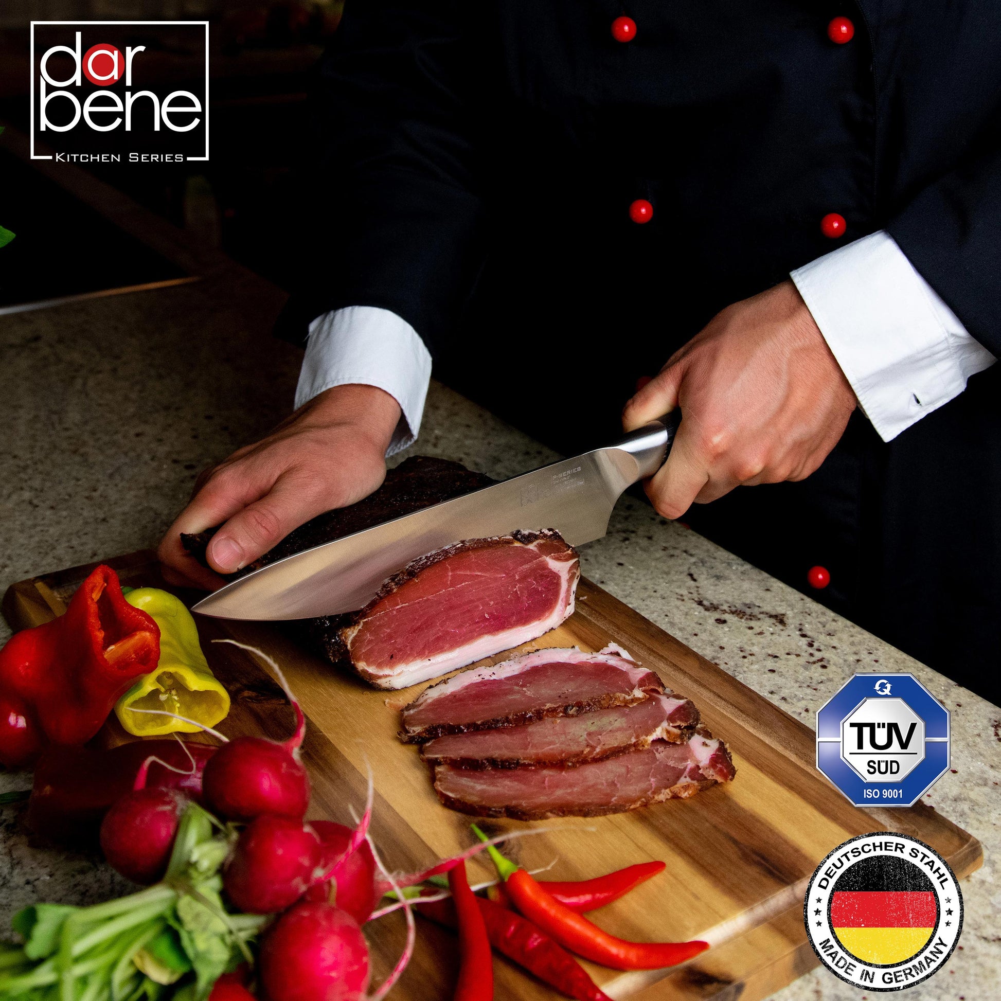 KÜCHENEMPFEHLUNG – Unsere DarBene Küchenmesser wurden gemeinsam mit Profiköchen aus renommierten Gastrobetrieben über 6 Monate getestet und optimiert - für eine sichere Handhabung, langlebige Qualität und Freude am Kochen.