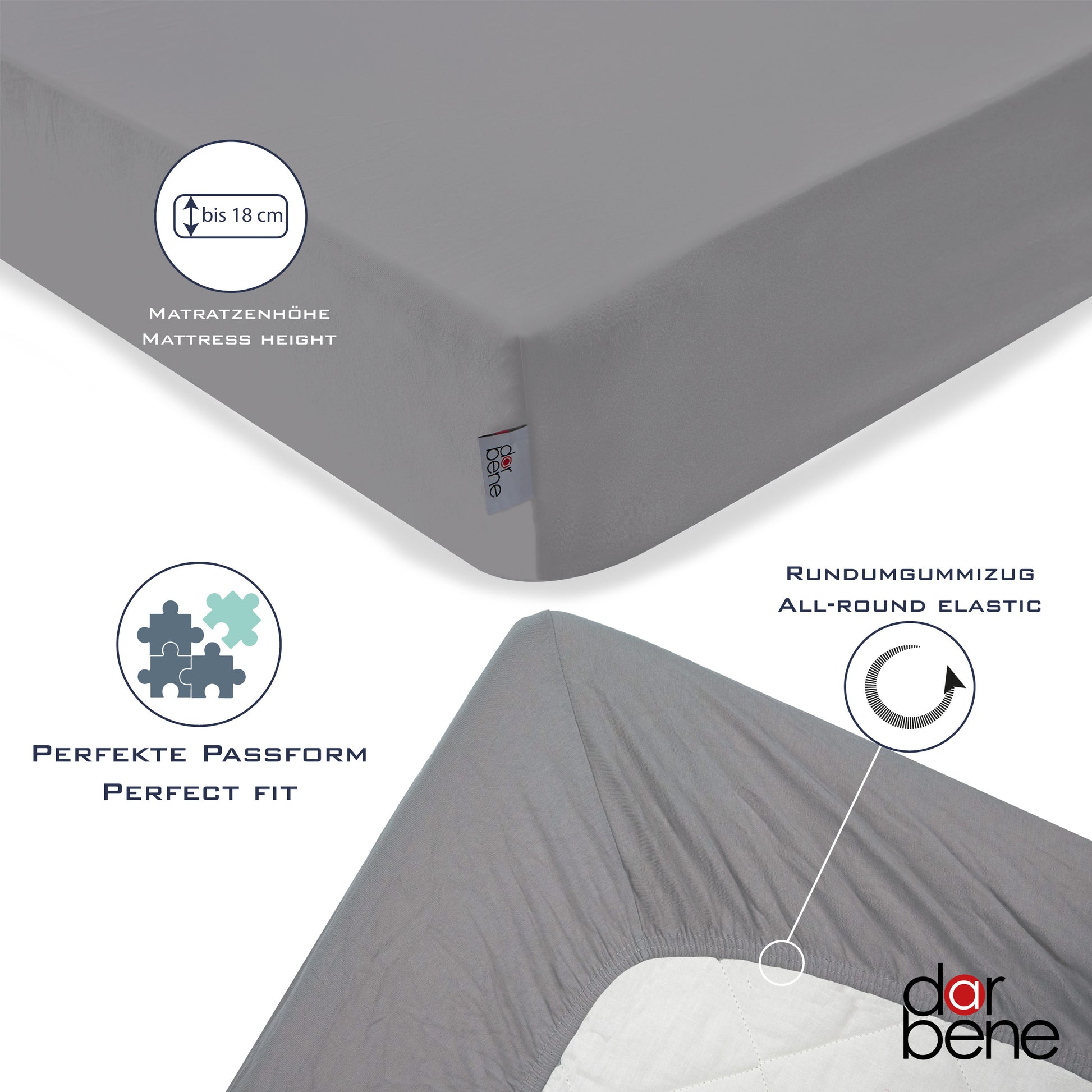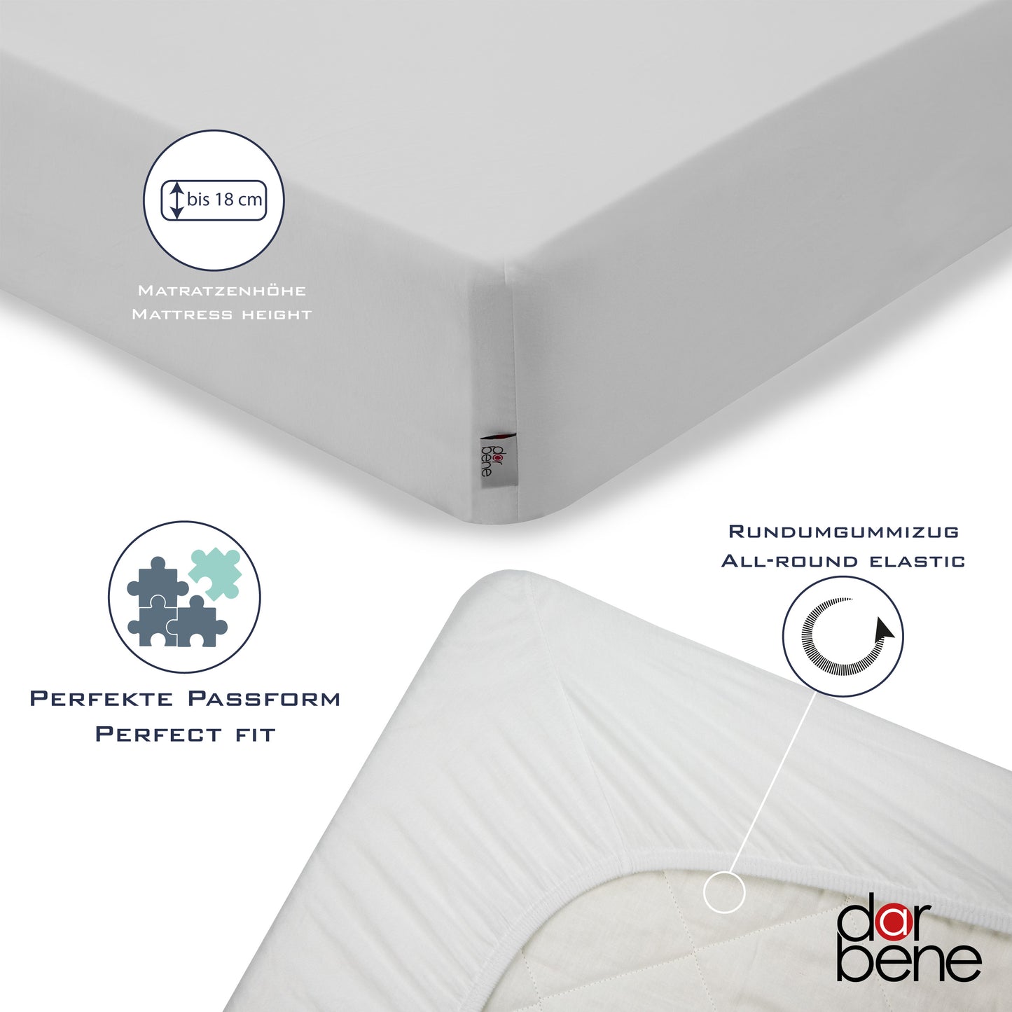 • Der entscheidende Unterschied zur Billigware! Ihr neues DarBene Premium Spannbettlaken passt einfach zu Ihrer Matratze wie eine zweite Haut und umhüllt diese fusselfrei. Passend für alle handelsüblichen Matratzen bis 18 cm Steghöhe. Bestimmen Sie ganz einfach Ihre Steghöhe indem Sie die Höhe Ihrer Matratze ausmessen. Erwerben Sie nicht einfach irgendein Spannbettlaken für Ihre Lieblinge – zertifizierte Qualität für erholsamen Schlaf.
